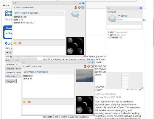 Стильный ajax чат для joomla 1.5 от yopensource.com. Компонент легок в установке и использовании.С Джумлой вожусь недавно.