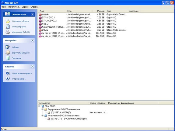 Программа для эмуляции CD/DVD приводов. Alcohol 52% позволяет создавать точные копии дисков и загружать их в виртуальные накопители.
