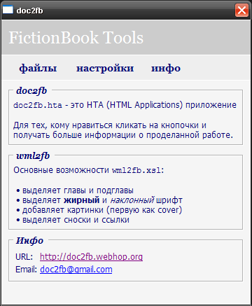htmlDocs2fb2 - Программа для конвертации документов в формате html и doc (MS Word) в формат электронных книг FictionBook версии 2.1 (fb2).См. также: upup2epub - epub-конвертер.