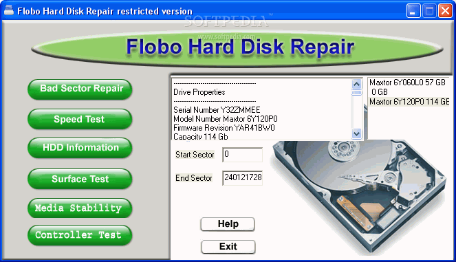 Flobo Hard Disk Repair includes : bad sector repair tool, test speed , S.M.A.R.T. information, surface test, check media stability and controller test. Is the hard disk drive monitoring and failure prediction and repairing software for repair and testing.