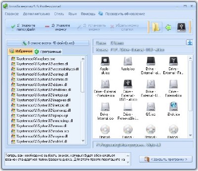Для более быстрого доступа к избранным значкам в IconTo содержится небольшой список системных ресурсов Windows, в которых находятся значки, список, который, можно пополнять самостоятельно.Так же, в программе присутствуют встроенные значкиЧто нового в версии 5.5